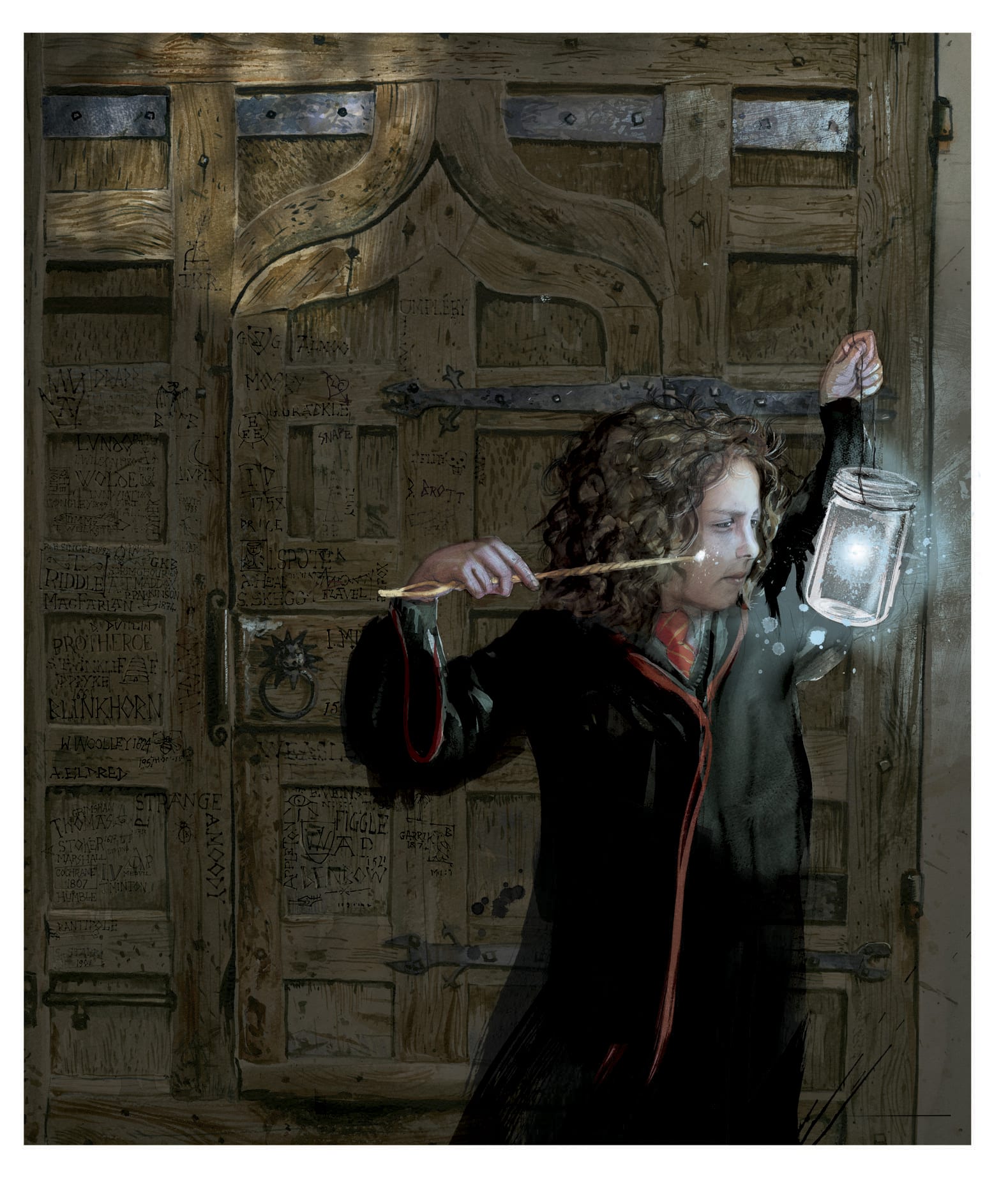 Můžeme se podívat, jak si ilustrátor představuje kouzlící Hermionu. (nepřijde vám, že tu hůlku drží trochu jako prase kost?)